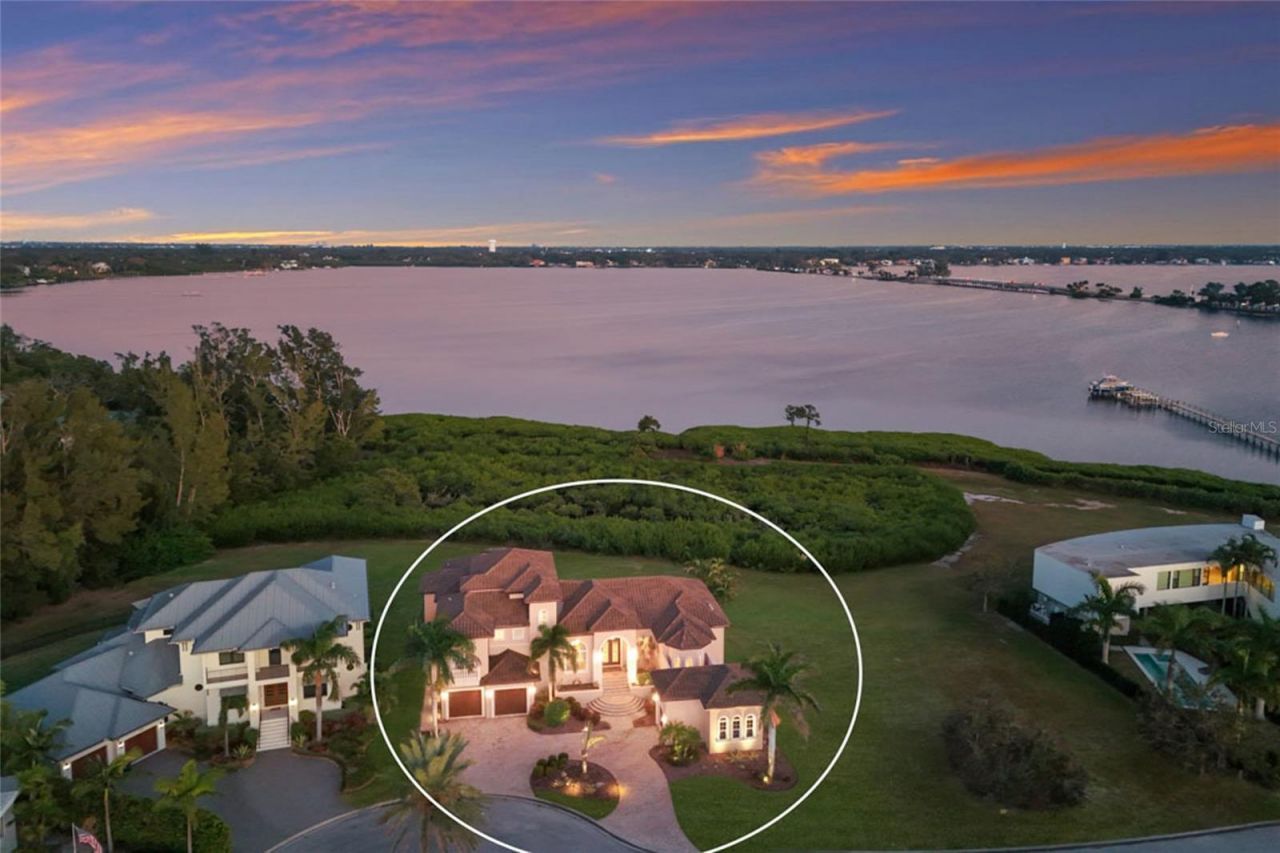 DIRECT BAYFRONT CUSTOM BUILT HOME IN GATED PALMA SOLA POINTE! Exceptional newer construction WATERFRONT residence with a POOL and DEEDED BOAT SLIP. Current owners spared no expense building this incredible house!!! Offering 3-4 bedrooms plus an office, 4.5 baths, and a 3-car garage-with the option to convert the TV room into a full ensuite 4th bedroom if desired. This commanding Mediterranean-inspired home makes a striking first impression. Elevated to maximize sweeping bay views, it welcomes you with a curved paver driveway, mature tropical landscaping, and dramatic exterior lighting. Stone columns, double front doors, varied rooflines, balconies, and thoughtful architectural detailing create depth and grandeur, all set against an unforgettable backdrop of Palma Sola Bay. Inside, the iron and glass doors open to a foyer framed by tray ceilings, custom millwork, and architectural columns that establish an elegant tone. The open-concept great room unfolds beyond, highlighted by exposed wood beams, recessed lighting, and wide glass sliders that capture panoramic water views and provide seamless access to the lanai and pool terrace. Nearby, the formal dining room offers a refined setting for gatherings with a double tray ceiling, chandelier, and arched windows dressed in custom drapery. At the center of the home, the chef's kitchen blends beauty and function with a massive granite island, custom cabinetry, glass-front uppers, and premium appliances including a Wolf gas range beneath a stunning architectural hood. A hidden walk-in pantry enhances storage and organization. Views of the pool and bay make this a standout space for both daily living and entertaining. The primary suite is a serene retreat designed to immerse you in amazing water views. The spacious bedroom features a double tray ceiling and room for a sitting area, while the spa style bathroom showcases rich wood cabinetry, dual vanities, elegant lighting, and an impressive walk through stone shower accented by arched windows. Two custom closets provide extensive storage and organization. Two additional guest suites offer generous layouts and private baths. Offering an ELEVATOR for easy access to each floor and a whole home generator for added peace of mind. Additional flexible space includes a lovely TV/bonus room that can be converted to an ensuite bedroom if preferred. This home also features a laundry room with cabinetry and utility sink. Outdoor living is a true showpiece. The expansive covered lanai features a wood-paneled ceiling, recessed lighting, ceiling fans, and a full outdoor kitchen with granite counters, built-in grill, hood, sink, and beverage refrigerator. The travertine deck surrounds a resort style pool and elevated spillover spa framed by elegant railings and unobstructed views of the water and natural preserve. Enjoy al fresco dining, evening cocktails by the fire table, or peaceful sunset viewing. The deeded boat slip provides quick access to Palma Sola Bay and the Gulf for fishing, boating, or relaxing at local sandbars. UNBEATABLE LOCATION: Surrounded by Palma Sola Bay and the 682-acre Robinson Preserve with trails, kayak launches, and scenic lookouts. Just minutes to IMG Academy, the beaches of Anna Maria Island, and an easy drive to downtown St. Pete and Sarasota.